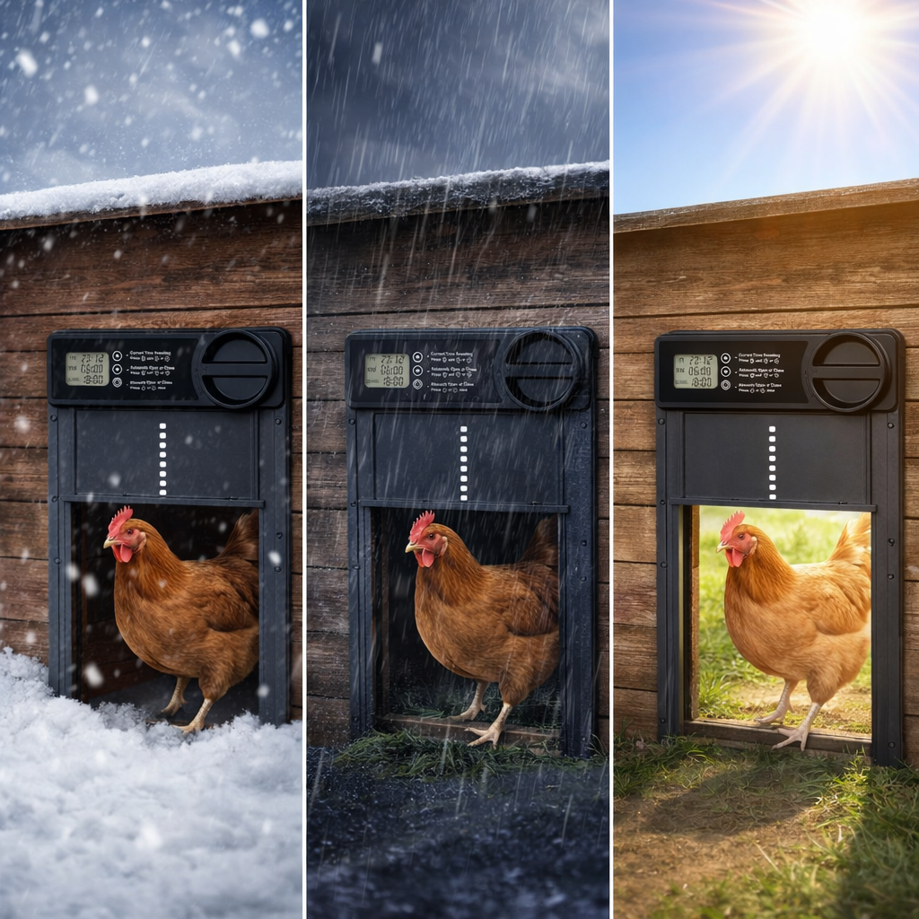 A: Absolutely, our coop door has been built with weather-resistant materials and a sealed motor housing so it operates in all weather conditions all year-round. Built to diversify how you use it, our door works seamlessly with the automatic timer or can be operated manually whenever needed.